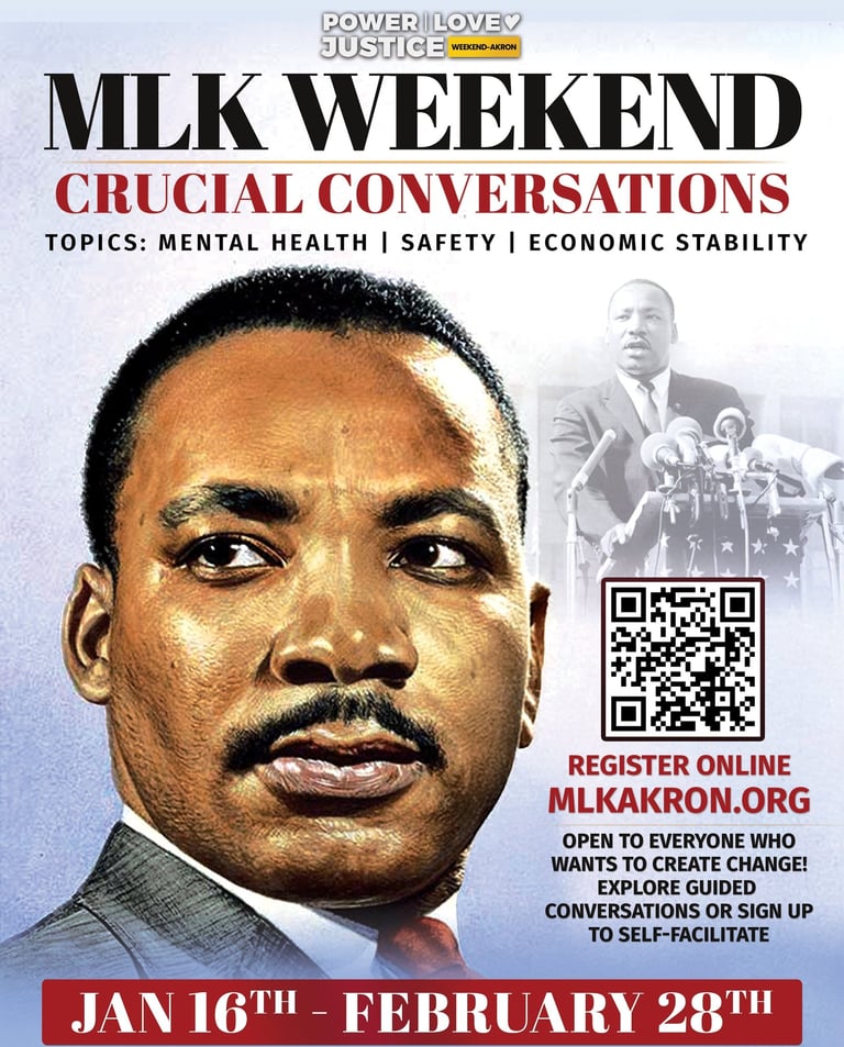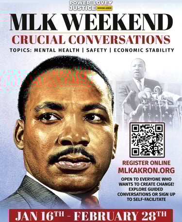 Join us for the 2026 Crucial Conversations at the MLK Power, Love, and Justice Weekend-Akron. This initiative brings together individuals and organizations to address the current state of Akron and redefine public safety, mental health, and economic stability to ensure we are addressing the effects on wellbeing.